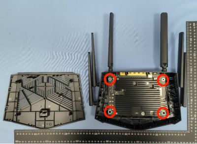On bottom of router, remove the 4 rubber pads and unscrew the 4 screws underneath. Using a pryer tool, remove top cover. It may require a bit of force to pry open, but be careful not to snap anything.